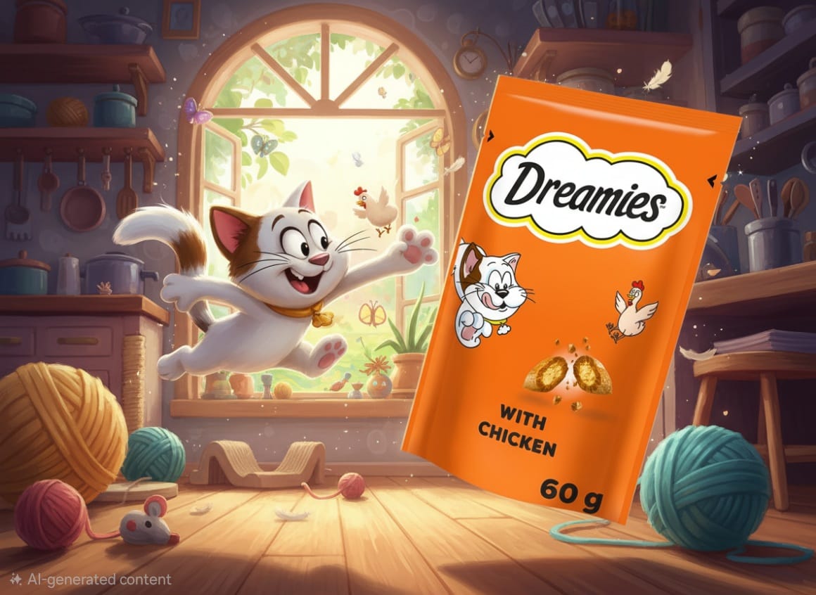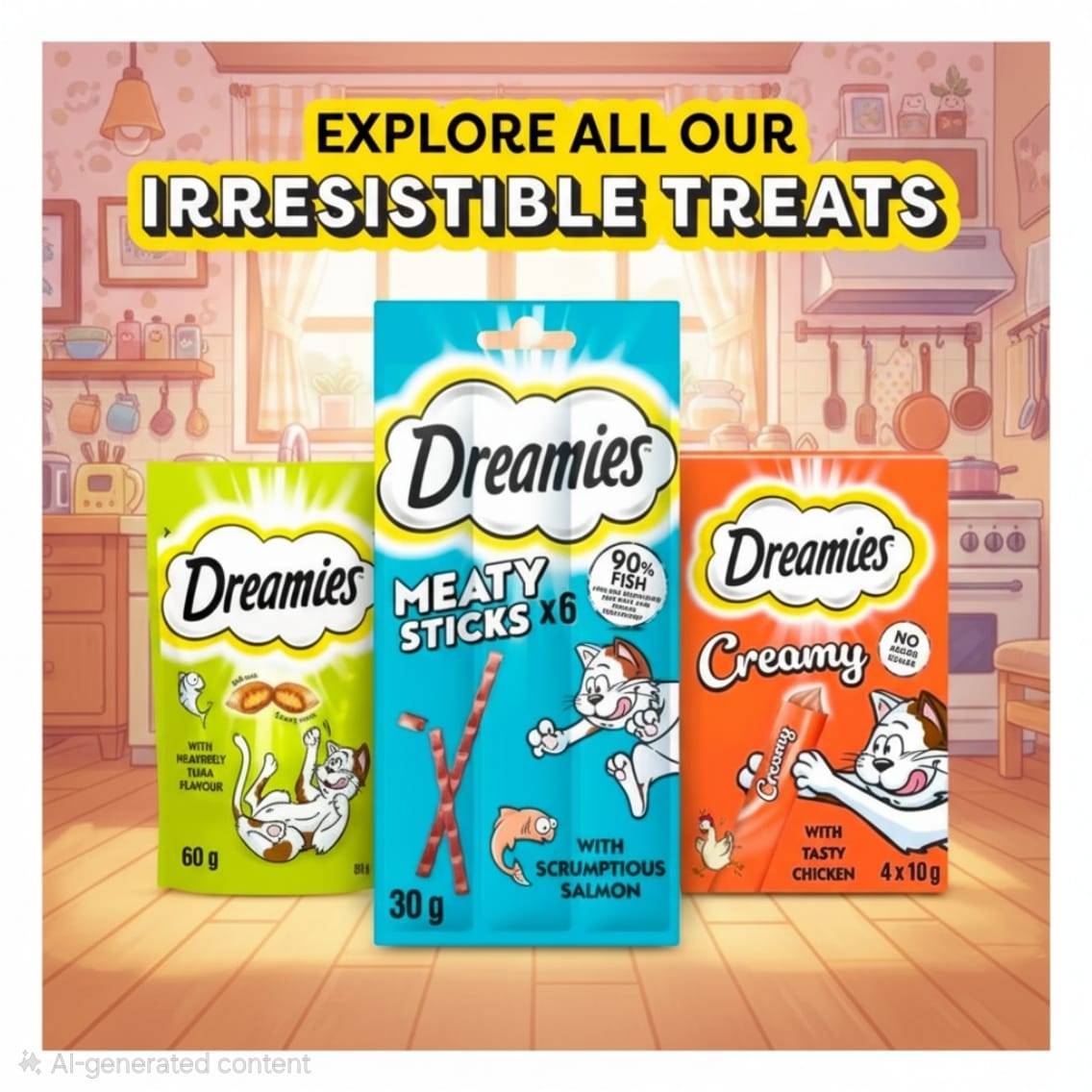 DREAMIES cat treats are packed full of things cats love. Share moments with your feline friend with these dual-texture treats with an enticingly crunchy outside and a soft inside. DREAMIES with Tasty Chicken contains vitamins and minerals, at just 2 calories per treat. So go on, give the bag a shake and watch your cat come running!Deliciously crunchy on the outside, soft on the inside cat treats.DREAMIESโข with Tasty Chicken cat treats contain vitamins and minerals & no artificial flavours.Only 2 kcal in every Dreamies cat treat.Dreamiesโข cat treats are available in 8 deliciously tasty flavoursThe Dreamies brand believes life with a cat should be fun-filled. Dreamies cat treats are a great way to spark spontaneous fun, playful moments between you and your cat every day.The irresistible, dreamiest combination of taste and texture means your cats will do anything for the great taste of Dreamies treats!Pack size: 60G -